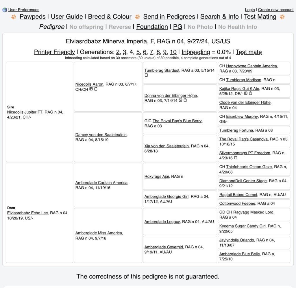 100% Original Ragdoll Lines traceable to Ann Baker’s 3 Original ancestral cats: Josephine (a solid white female), BURMESE (a female; called Blackie in some databases) and BIRMAN (a male; called Beauty in some databases) according to Dayton’s Genetic Card.