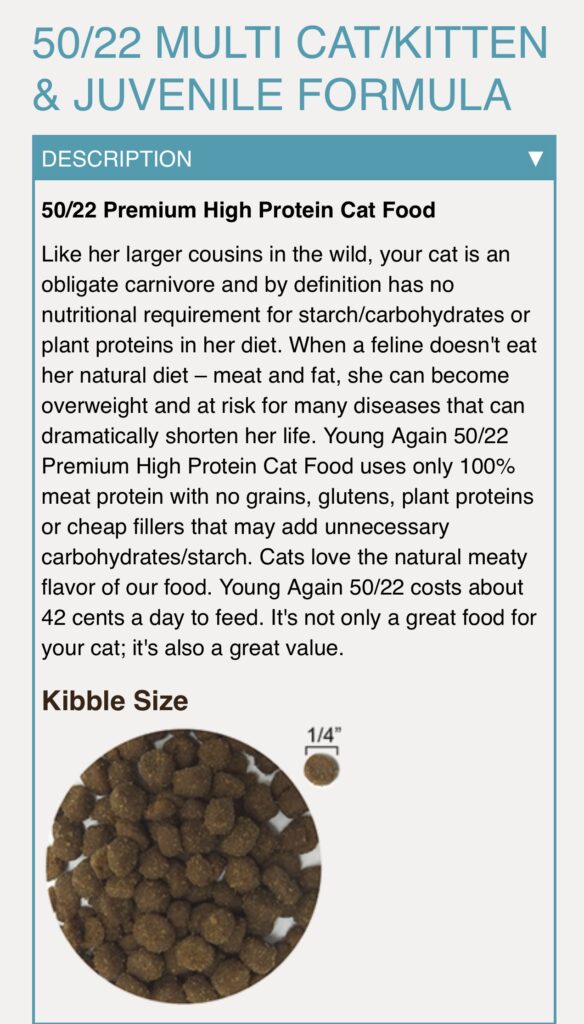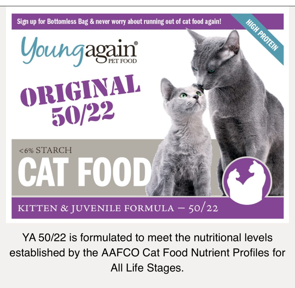 We are currently in the process of switching our breeding cats and kittens over to Young Again Cat Food, due to delivery issues, lack of communication with Life’s Abundance, and the fact that Young Again Cat Food is superior in overall ingredients. Click on the website listed below to place orders for food: