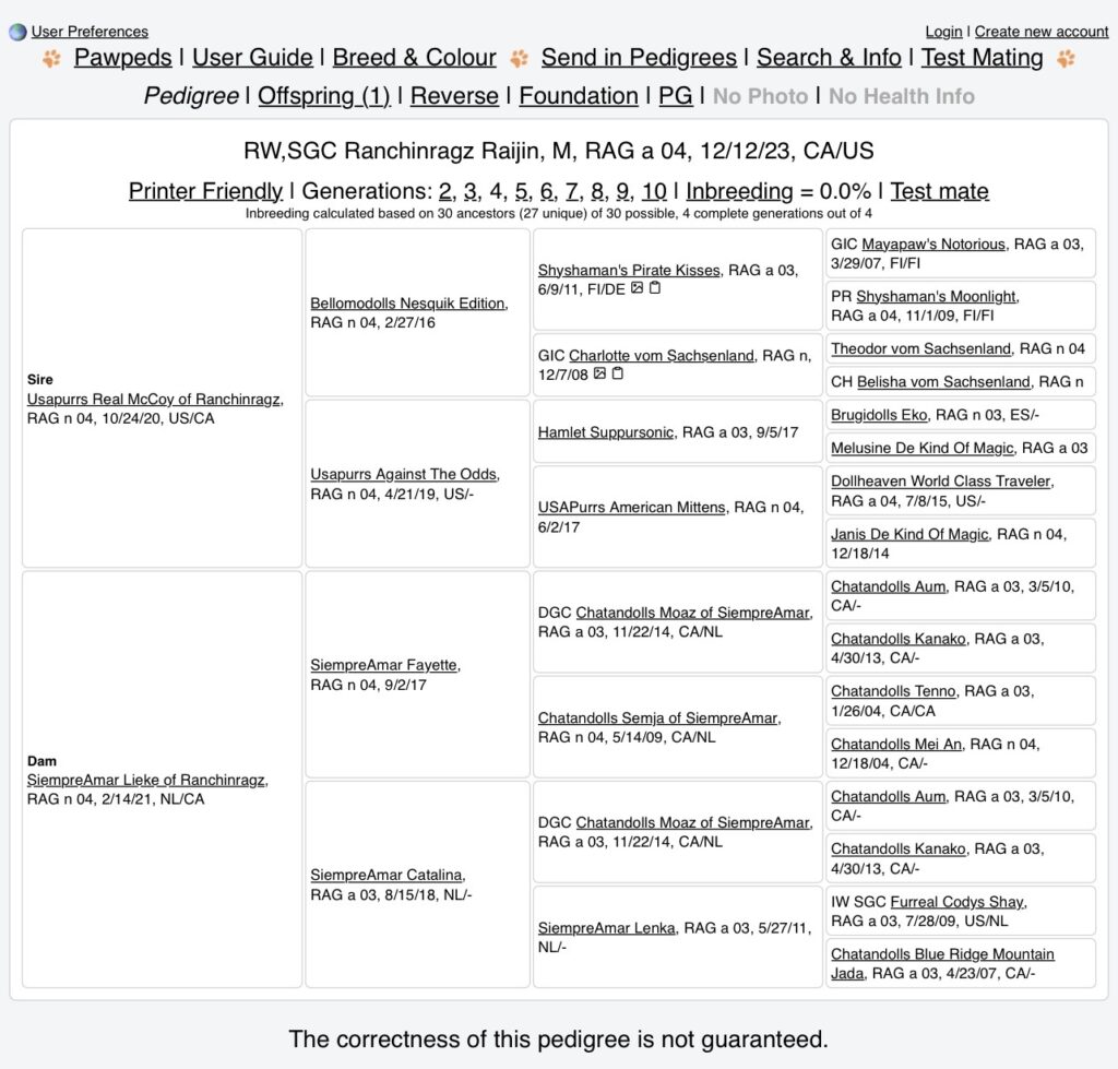 Raijin comes from the distinguished Ranchinragz lineage—one of the most highly regarded foundations in Ragdoll breeding. His ancestry is filled with champions and elite cats celebrated for their massive structure, luxurious coats, and reliably outstanding temperaments.