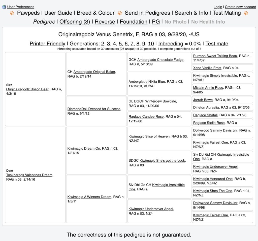 Venus hails from the prestigious OriginalRagdolz line — a cattery known for bold markings, excellent coat quality, and strong show results. Her pedigree reflects a blend of type, temperament, and longevity — with multiple titled cats contributing to her foundation.